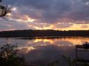 The lake is tinted orange, the sun sinks through the trees.